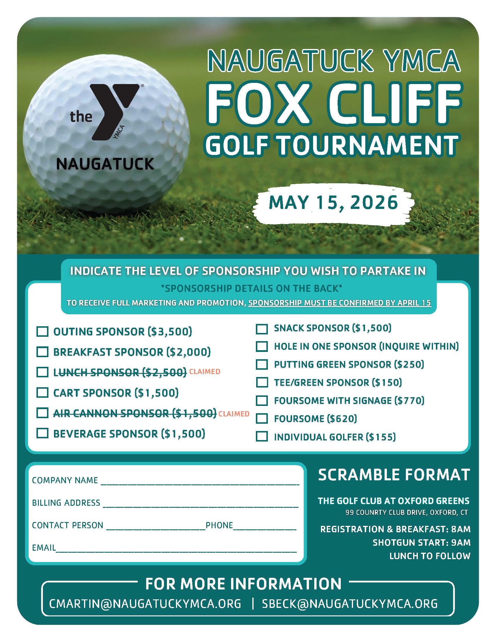 Join the Naugatuck YMCA the 1st Annual FOX CLIFF GOLF OUTING on May 18, 2026 at the OXFORD GREENS located at 99 Country Club Drive Oxford, CT 06478.