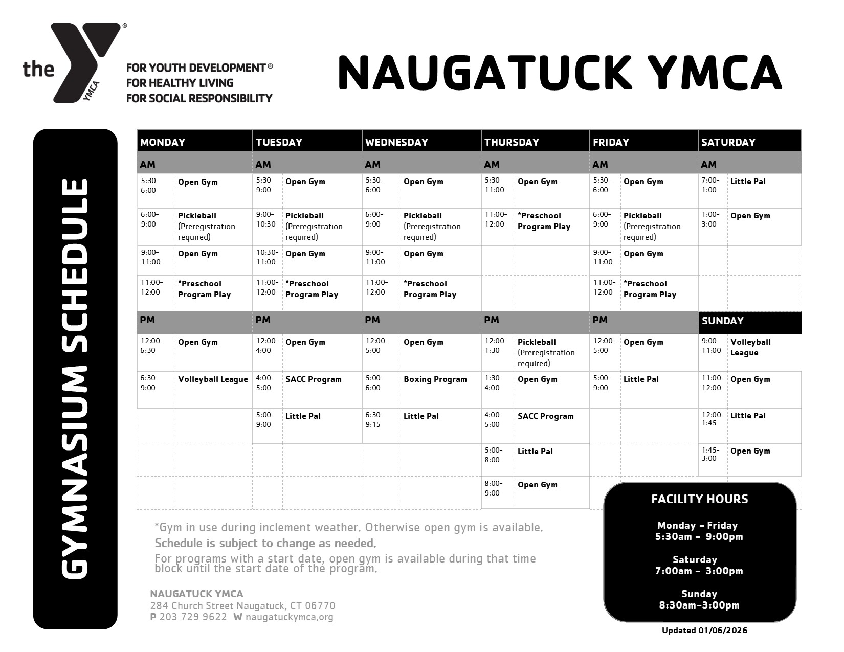 Gymnasium Schedule Effective January 9 2026